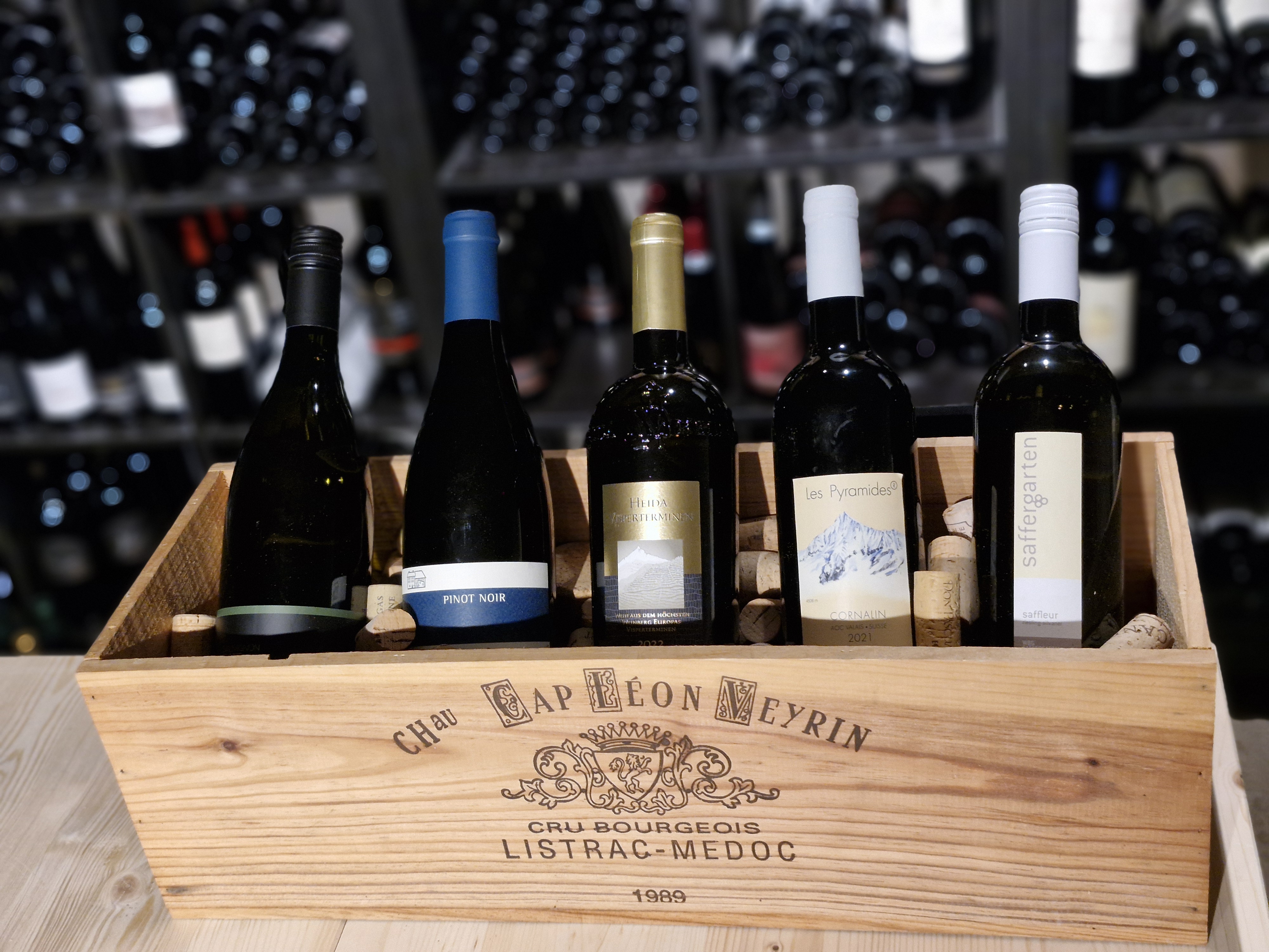 La Suisse - Eine Reise durch die Schweiz. 5 x 75cl Flaschen gemischt (rot & weiss) in einer Original Bordeauxholzkiste. CHF 120.00