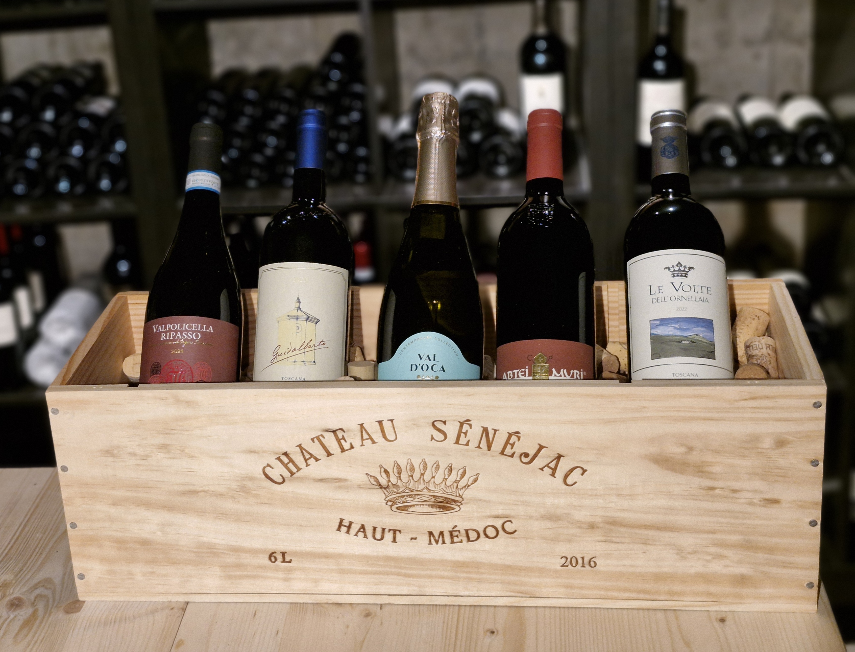 Bella Italia - Die italienische Lebensfreude. 4 x 75cl Flaschen namhafter Rotwein & 1 x 75cl Prosecco, in einer Original Bordeauxholzkiste. CHF 120.00